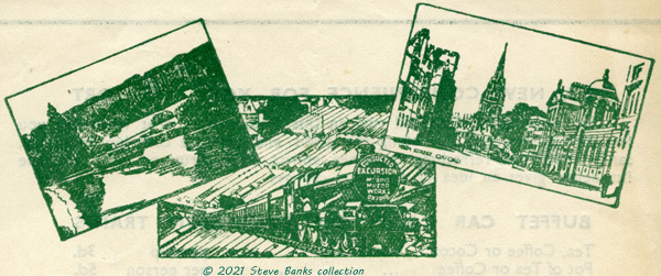 Refreshments were available on the train from a RESTAURANT CAR serving LIGHT REFRESHMENTS, a list of which was printed on the other side of the hand bill and is grinning through. This was chosen instead of one of the Section's buffet cars.