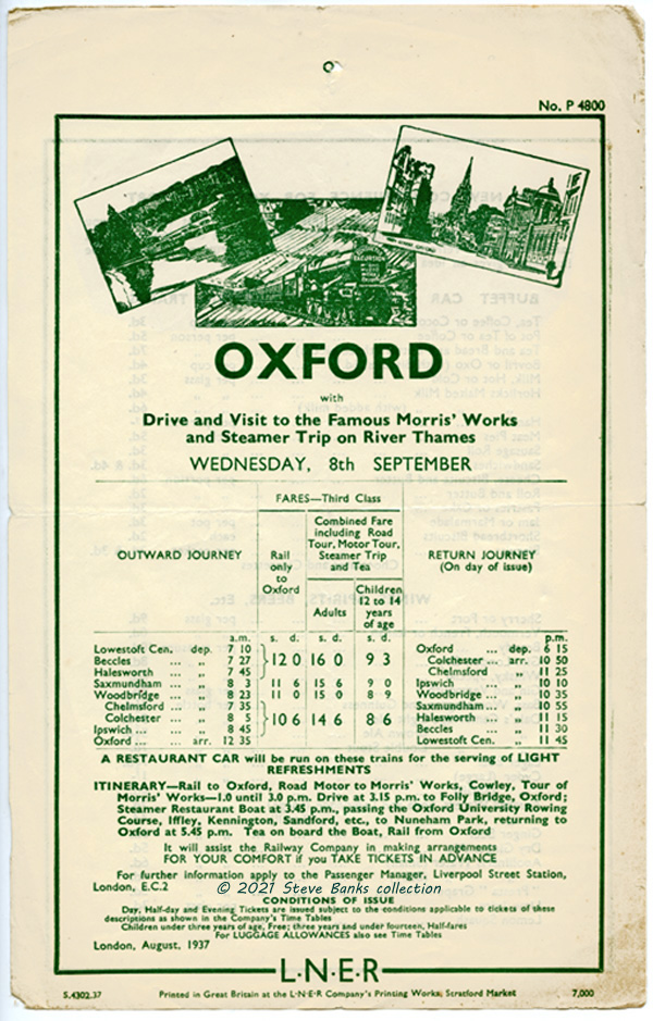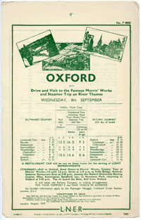 The Morris car works at Cowley attracted visitors from far and wide and the GWR was in favour because the LNER handbill from 1937 from East Anglia to Oxford, featured a GWR excursion hauled by a "Castle" with large circular headboard stating "CONDUCTED EXCURSION to the MORRIS MOTOR WORKS OXFORD". Other pictures show a pleasure boat on the river and Oxford High Street.
