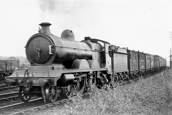 This is believed to be a Leicester-Chesterfield Ordinary Passenger train c1922. Behind the Atlantic are six GCR horse boxes, a 4w van of some kind, and at least two carriages.The horse boxes are a mixture of types, the leading three being early designs similar to 1X1. The ones further back look more recently built but are not clear enough to recognise.