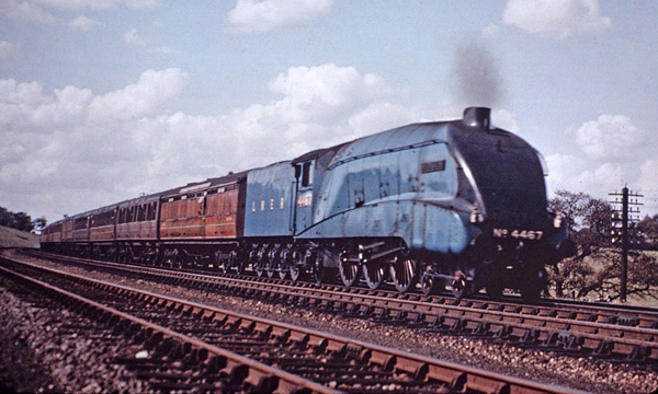 A4 No 4467 Wild Swan in the 1930s has an up express at an unknown location. Colour reproduction is notoriously unreliable but this picture does give a good idea of what most LNER varnished teak carriages looked like, and the effect of revarnishing, which has been applied to the body of the BG behind the tender. These effects can actually be seen today on preserved lines where restored carriages undergo the same transitions.