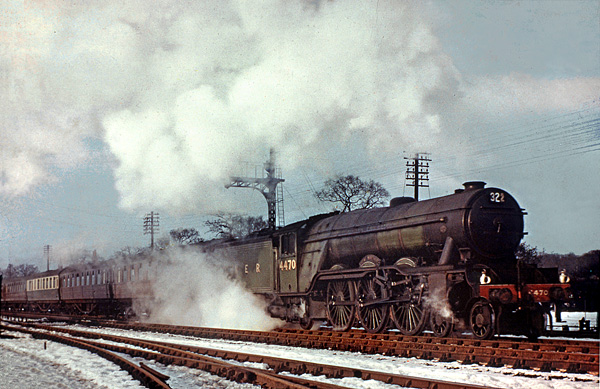 My apologies for the motion blur but this is an early evening picture, a low shutter speed would have been used and the panning wasn't all that successful. The only info with the slide is the loco, A3 60102 Sir Frederick Banbury, a date of 1954 and "Rugby Central", so let's see what can be discerned?