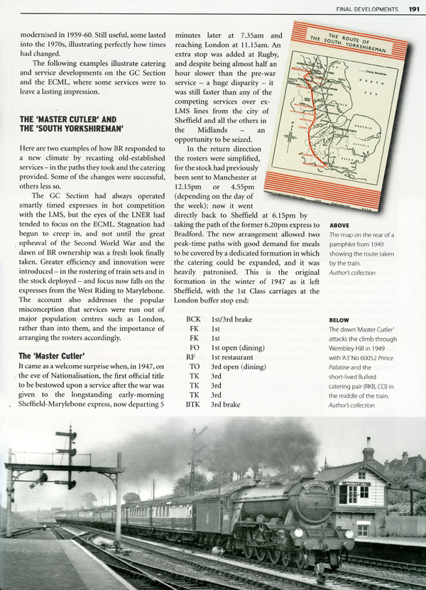 Specimen page from Chapter 2: Through Coaches and Portions / Harrogate, where workings between Harrogate and King's Cross via Leeds Central are described and how they changed during LNER and BR days. The illustrations show two versions in the 1930s and 1950s. Details of the rosters are on adjoining pages.